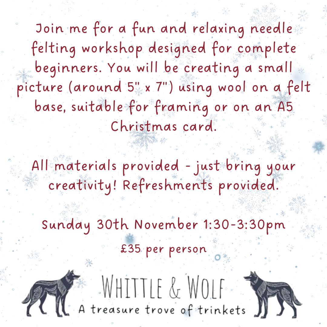 Join me for a fun and relaxing needle felting workshop designed for complete beginners. You will be creating a small picture (around 5" x 7") using wool on a felt base, suitable for framing or on an A5 Christmas card.